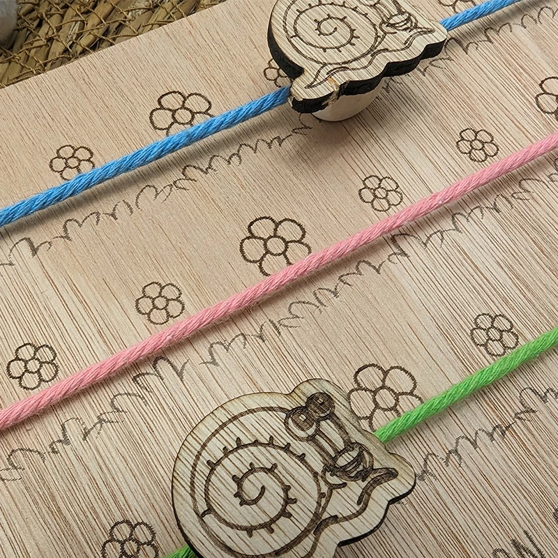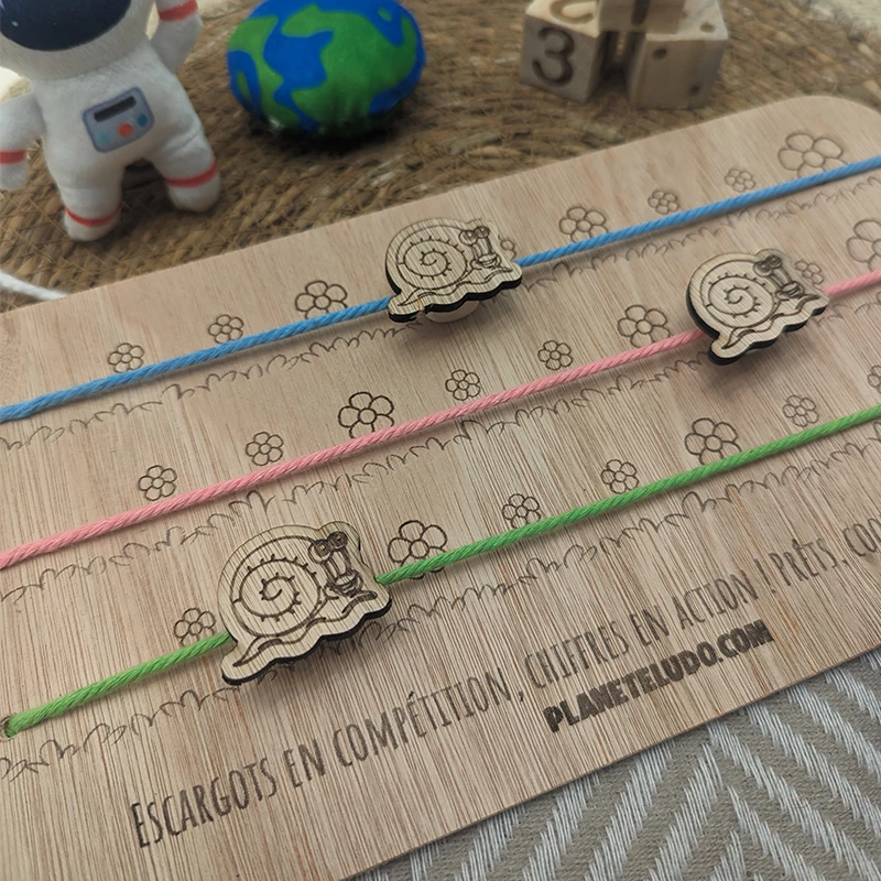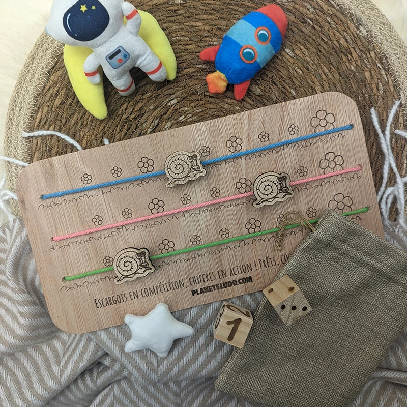 Le but du jeu : les enfants lancent le dé à tour de rôle, et en fonction du chiffre obtenu, ils font glisser leur escargot le long de la corde, en passant par les fleurs gravées sur le bois. Chaque fleur représente un nombre, et le défi consiste à atteindre la dernière fleur géante en comptant correctement.