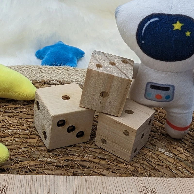 Deux dés en bois à six faces avec les nombres 1,2, 3 et un avec des points de 1 à 3, soigneusement rangé dans un étui en toile de jute