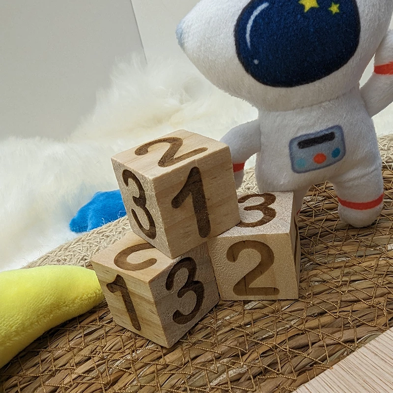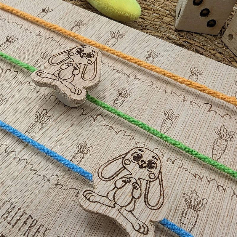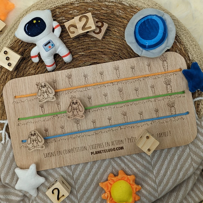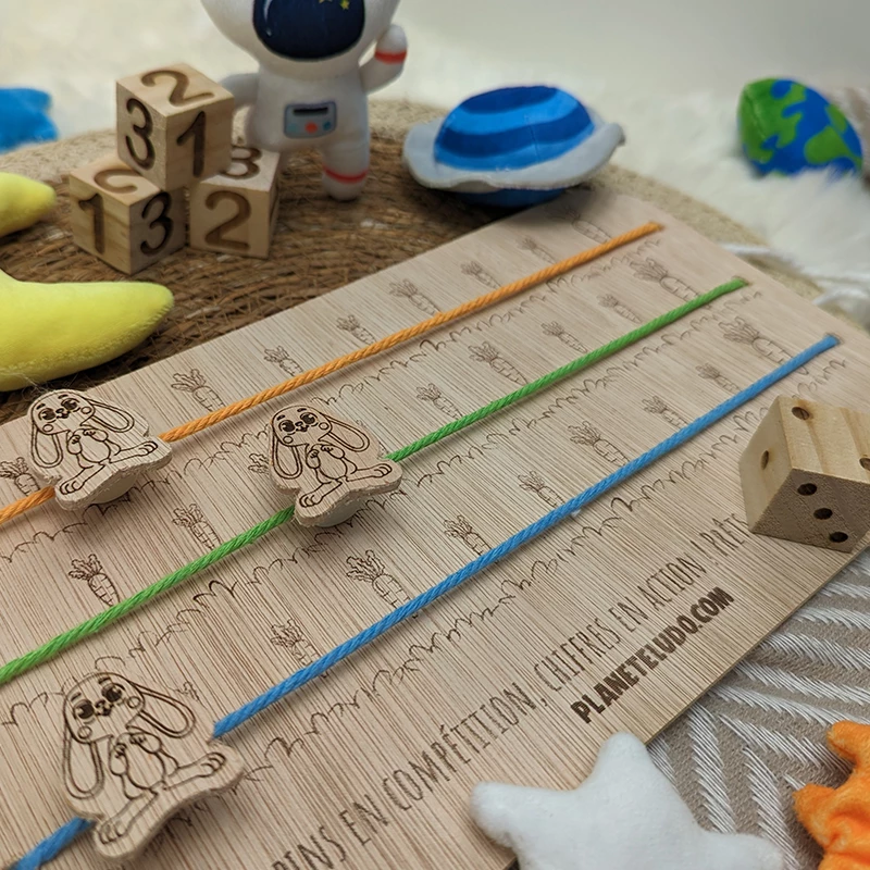 Le but du jeu : les enfants lancent le dé à tour de rôle, et en fonction du chiffre obtenu, ils font glisser leur lapin le long de la corde, en passant par les carottes gravées sur le bois. Chaque carotte représente un nombre, et le défi consiste à atteindre la dernière carotte géante en comptant correctement.