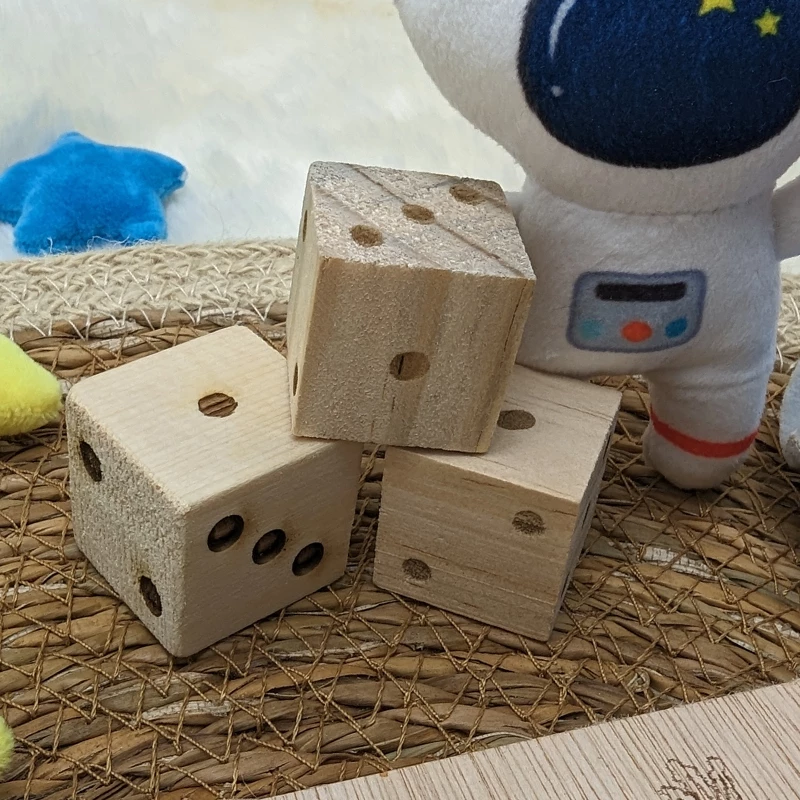 Deux dés en bois à six faces avec les nombres 1,2, 3 et un avec des points de 1 à 3, soigneusement rangé dans un étui en toile de jute