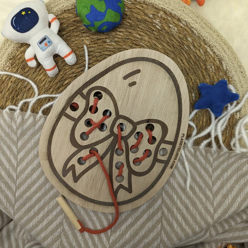 Ce jeu ludique contribue, entre autres, au développement de la préhension fine, de la coordination motrice, de la perception spatiale et à l'apprentissage des couleurs. Avec sa cordelette en coton, l'enfant pourra apprendre à contrôler ses mouvements, maîtriser ses gestes, mais aussi développer la manipulation d'un outil.