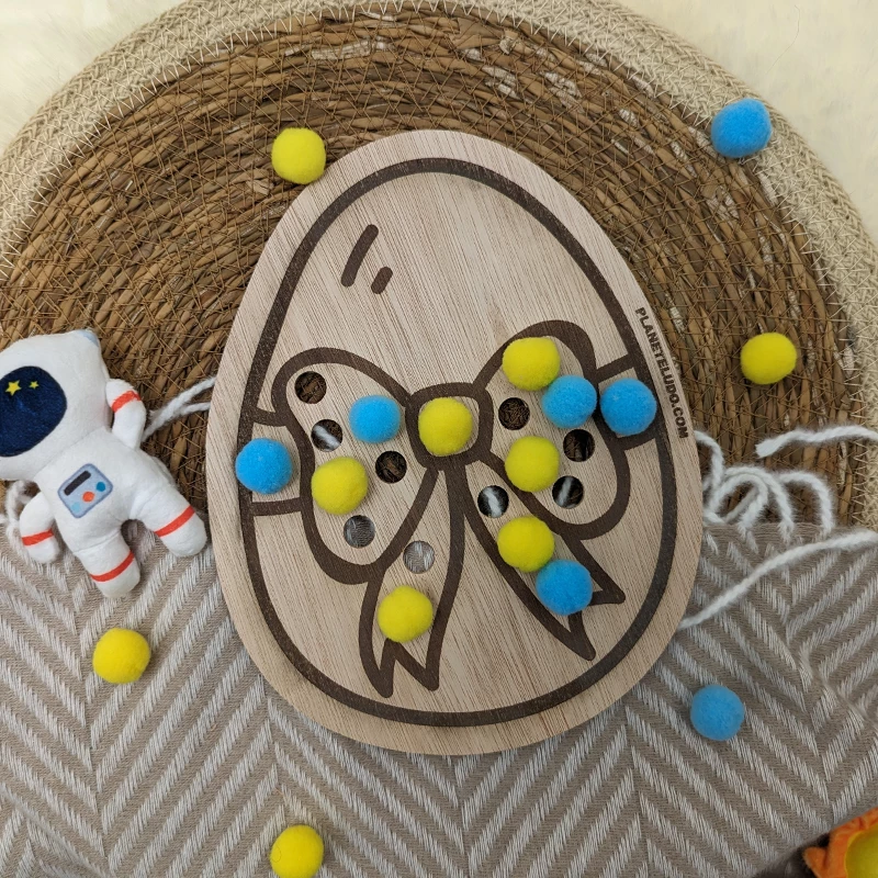 Motrices fines, la discrimination visuelle et la coordination visuo-motrice, apprentissage des couleurs avec notre Coconœuf l’Œuf. Enfilez, positionnez, ordonnez et triez les pompons colorés grâce à sa cordelette et pompons, offrant une expérience ludique d’apprentissage des couleurs.