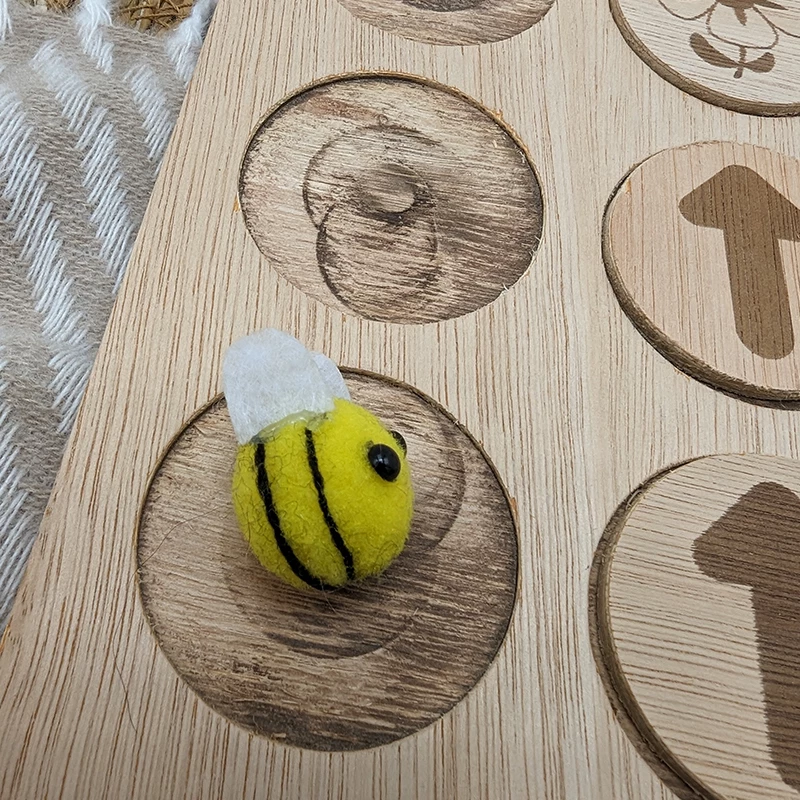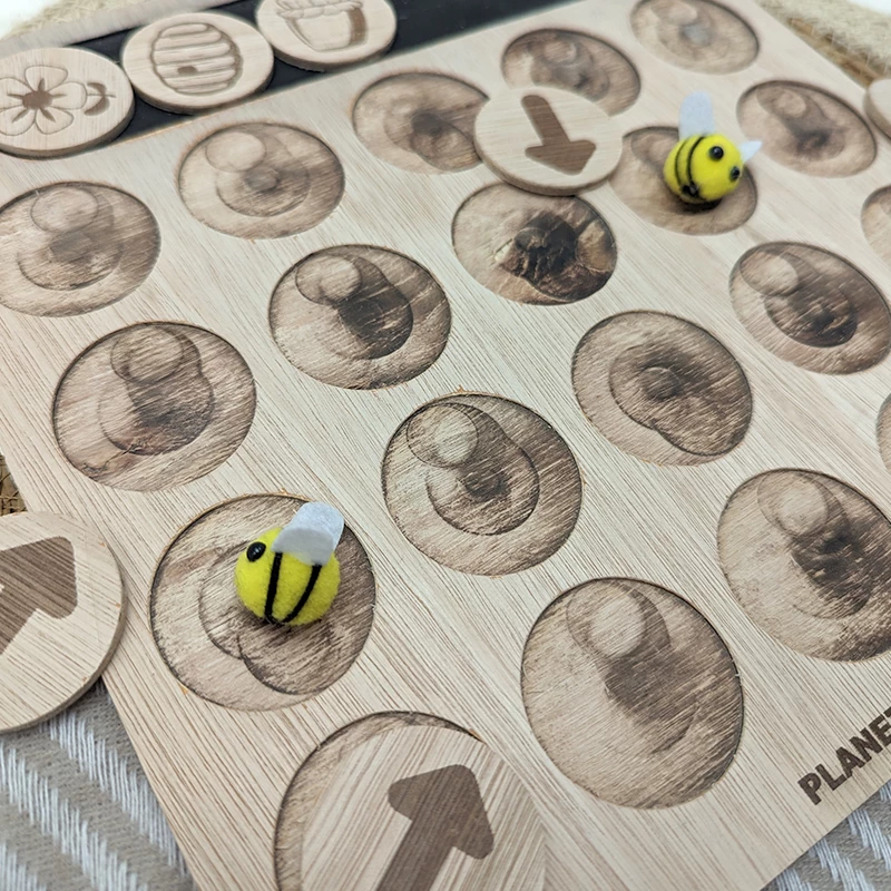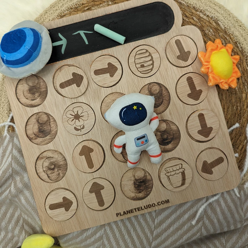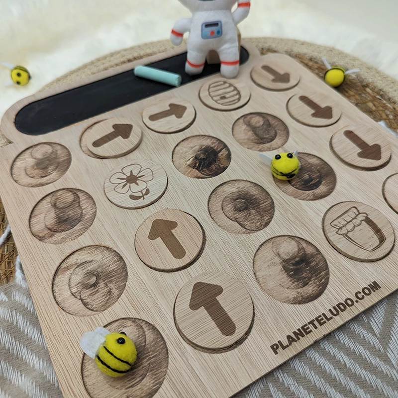 Ce tableau creusé de cercles permet une multitude d'activités mais ici on vous présente le jeu du labyrinthe. Hé si on aidait notre abeille Api a trouver les fleurs à butiner ou encore aider Janot Lapin a retourner à son terrier? Grâce aux flèches directrices l'enfant pourra aider nos amis à arriver à bonne destination.